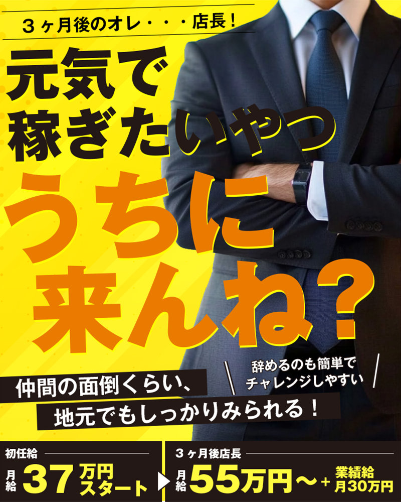 研修無しで月給37万円以上!経験者チャンス!3店舗出店予定でポスト多数有!23歳~30代前半積極採用